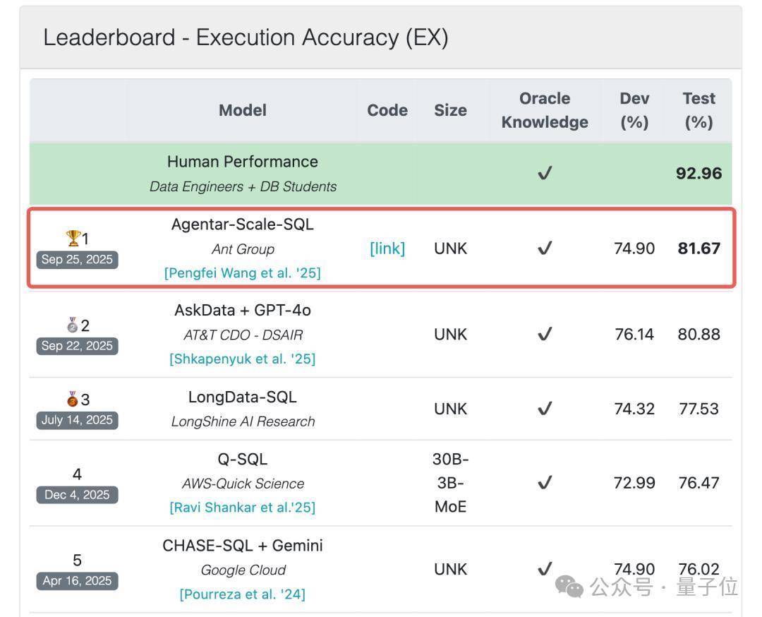 就在今年9月,蚂蚁数科的Agentar-Scale-SQL在BIRD榜单上以执行准确率(81.67%)和执行效率(77%),双料第一的成绩登顶一举超越了谷歌、亚马逊等国际科技巨头。
