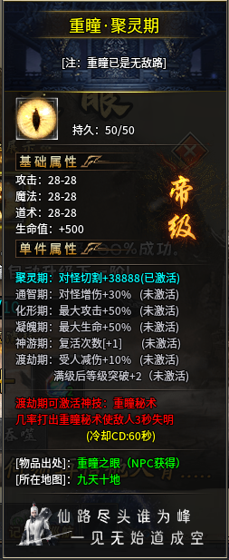 比如重瞳之眼,是进入四大陆后的一个重要装备,别看它的基础属性一般,但它升级后将带来大量的属性加成,到神游期后更是直接给玩家的复活次数直接加一,一些原本差一点就可以打过的怪在激活这个属性后即可轻松解决。