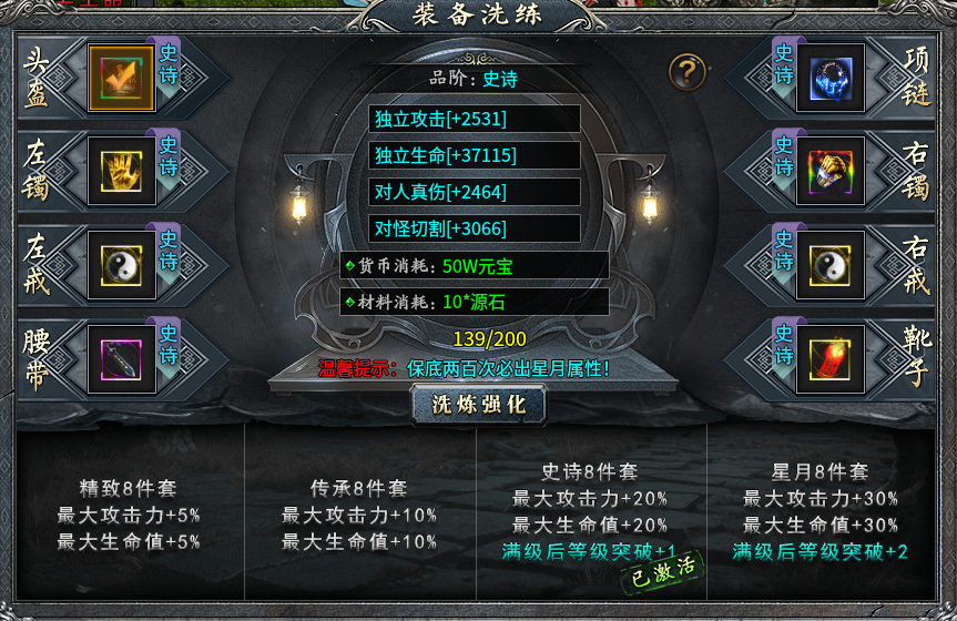 在装备洗练系统中,除剑甲以外的八件装备可进行洗练,经过洗练的装备可从独立攻击、独立生命、对人真伤、对怪切割获取加成,每次洗练都会消耗元宝和源石,洗练品阶由低到高可分为精致、传承、史诗、星月,每洗练200次必出一个最高级的星月属性,洗练凑齐八件套即可解锁洗练品阶的套装效果,如果出现全部八件装备全部洗练后品阶不一致,触发的套装效果将以身上最低品质的套装效果为准,登峰造极、大满足大惊喜完全不是梦。