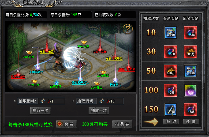 猎魔商城是游戏中一个刷怪抽奖的玩法,每击杀188只怪可以获得一个抽奖券,抽奖券可以用来抽取皮肤、天命卷轴等材料和货币。抽取次数还能领取奖励,冠名奖励会更丰厚,有不少加属性的酷炫足迹!这个抽奖次数不会清零,会一直累加,给足了诚意福利等待玩家不断探索。
