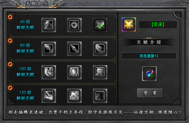 到了三大陆即可解锁天赋加点系统,有增加玩家攻速和对怪伤害的刷怪天赋,也有专门针对PK的天赋,让你在“刷怪效率”与“PK专精”间自由定制。自60级开始每20级解锁一行天赋,每行天赋只可选择一个天赋学习,学习天赋会消耗分解专属装备获取的源石,选择同行其他天赋也会消耗源石,如果又要重新选择之前的天赋同样还需消耗源石。