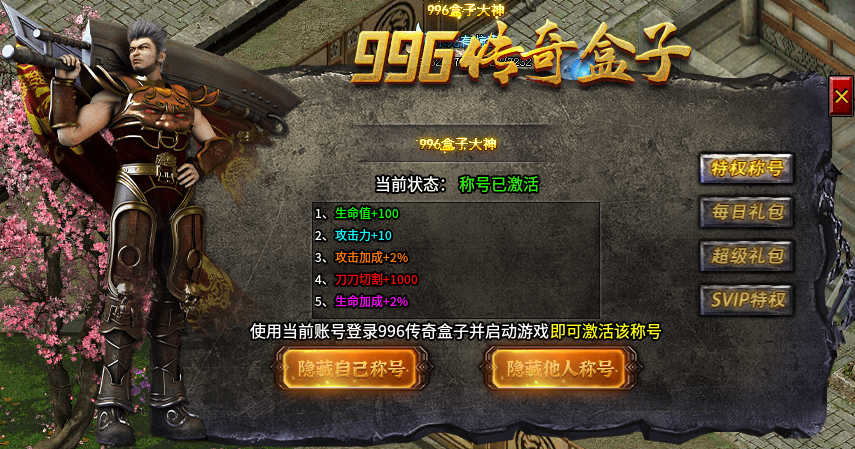 更有云挂机功能,不占手机存储空间,还可24小时持续在线挂机。使用盒子登录,还可免费获得996传奇大神称号,每日领取丰富的礼包福利,助力赢在起跑线。
